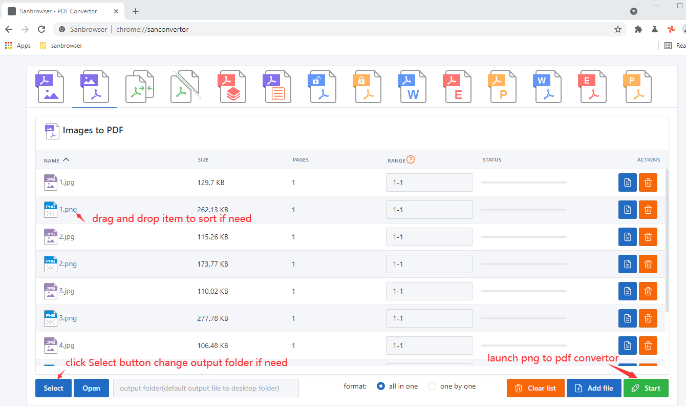 1. Open the png image to pdf converter tool provided by Sanbrowser. If you have not installed the Sanbrowser application,